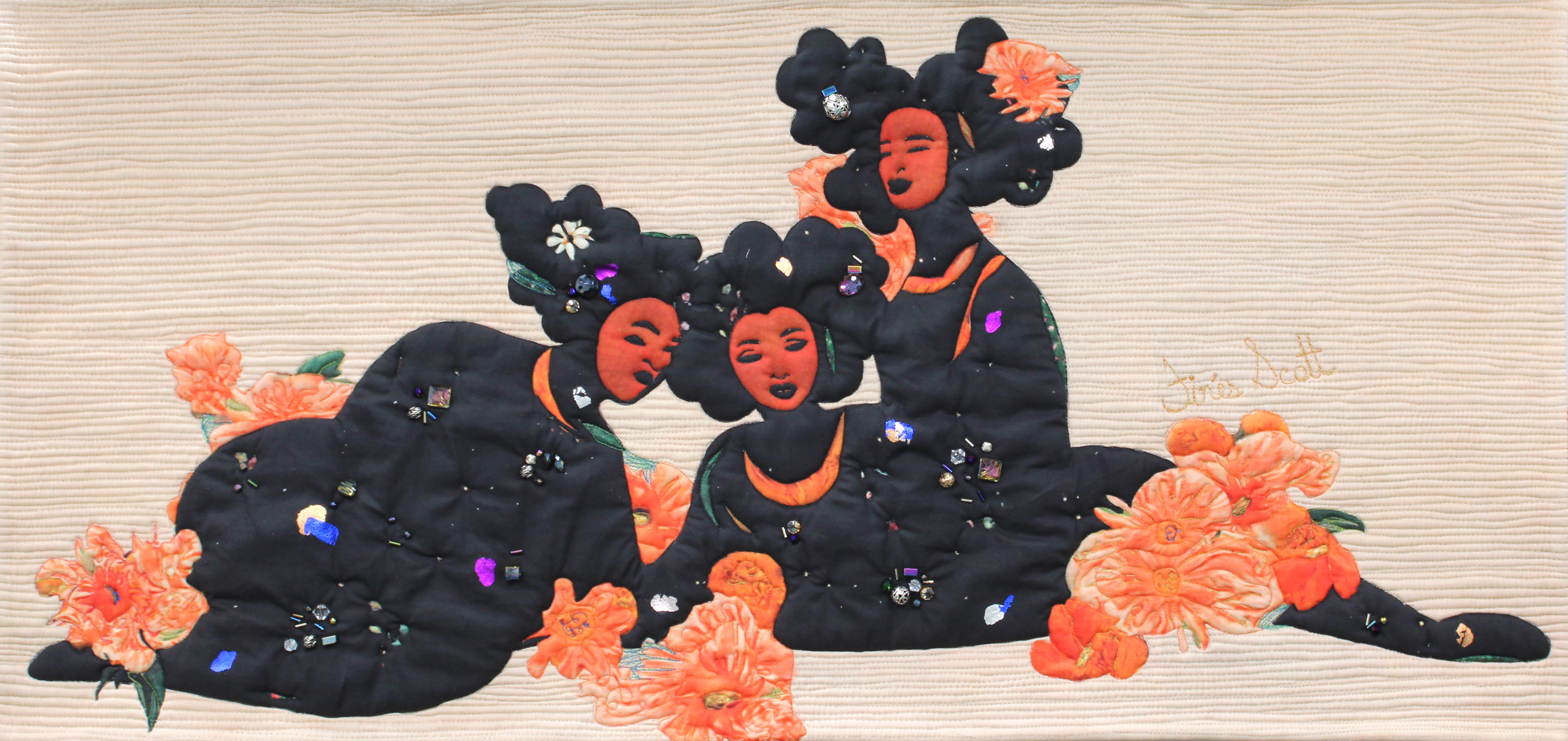 37.5" x 18", textile art, cotton, ink, crystal, metal, metal leaf, 2024